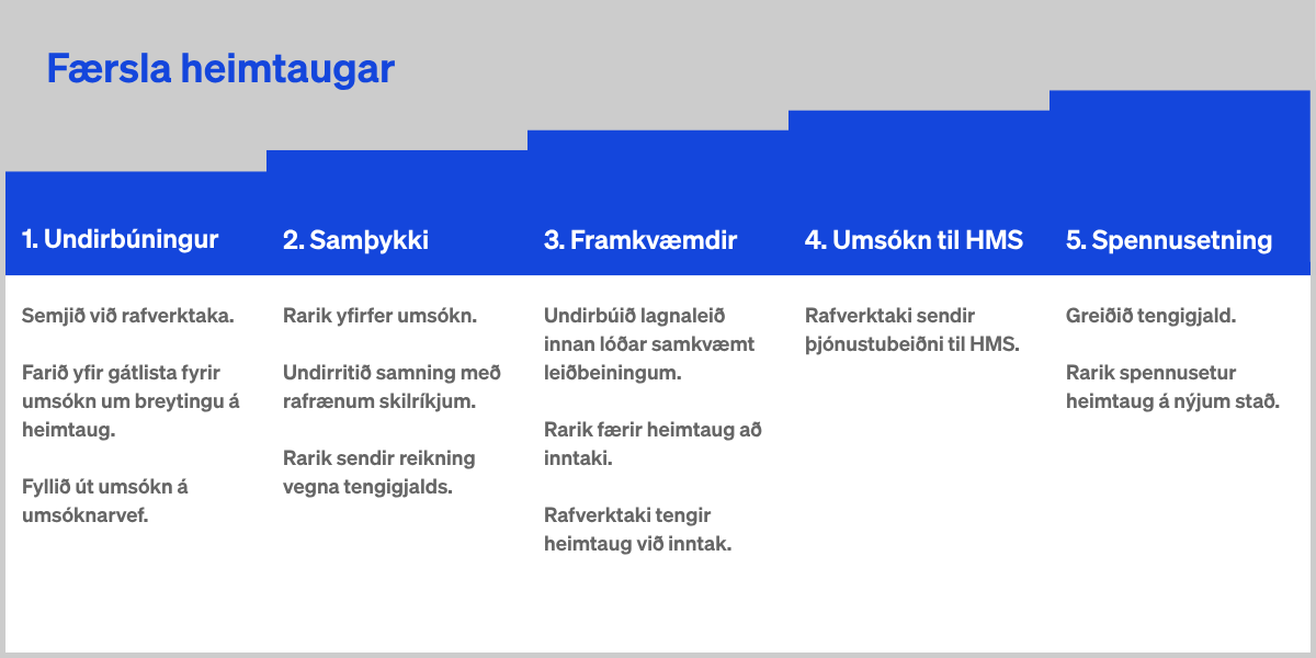 Þú getur sótt um færslu á heimtaug rafrænt í gegnum umsóknarvef okkar. Áður en þú fyllir út umsókn er mikilvægt að þú kynnir þér hvernig ferlið gengur fyrir sig og farir vandlega yfir gátlistann okkar.