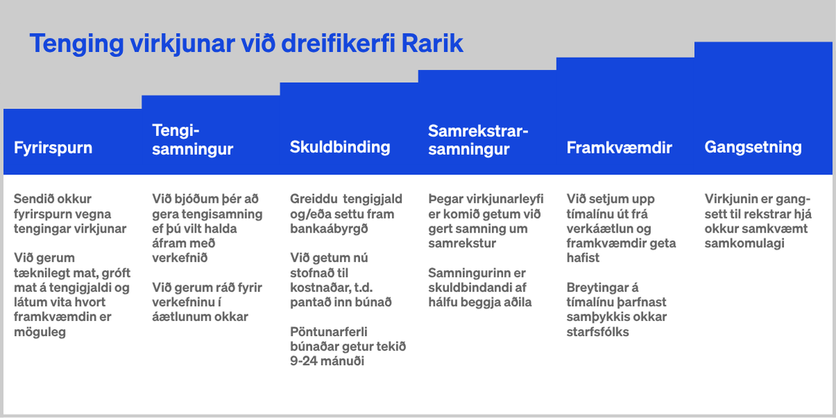 Ferlið við tengingu nýrrar virkjunar inn á dreifikerfi Rarik má skipta í sex skref. Hér fyrir neðan eru skrefin útskýrð í stuttu máli, auk þess er að finna svör við algengum spurningum.